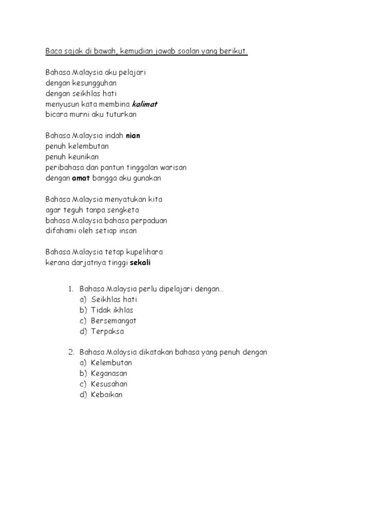 Baca dan fahami sajak yang diberi. 4.4.1 deklamasi sajak oleh guru dan murid rakaman sajak dalam tablet guru kerana sound laptop problem hari kena observed. Learning port interactive (lpi) merupakan portal pembelajaran yang dibina selaras dengan keperluan silibus pelajar tahun 1 hingga tingkatan . Deklamasi sajak dan nyatakan maksud sajak.